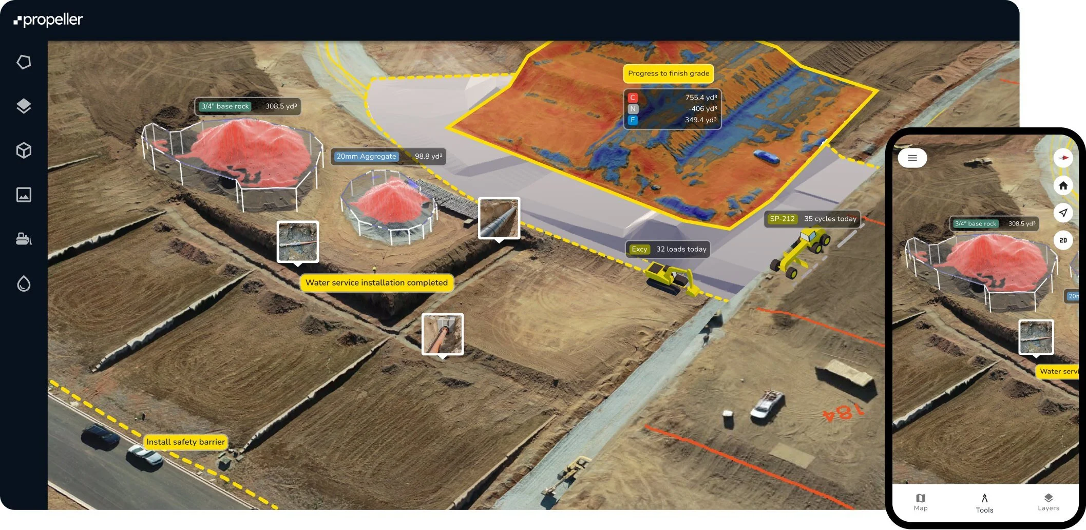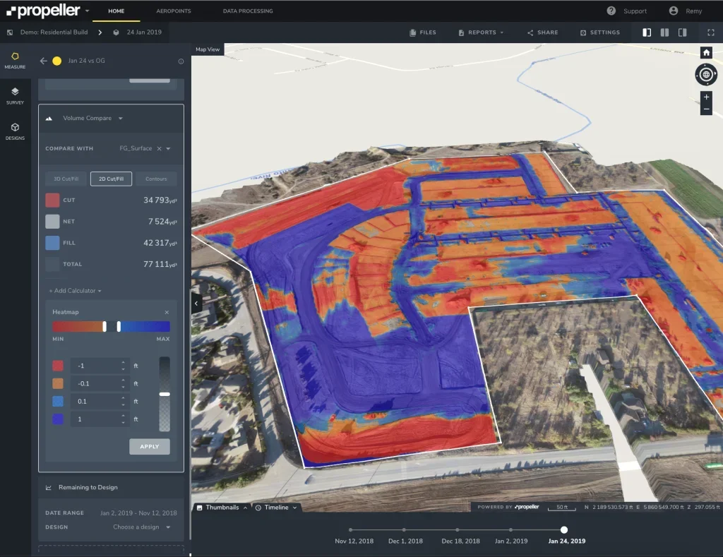 - 3D models showing elevation, grading, and structure progress